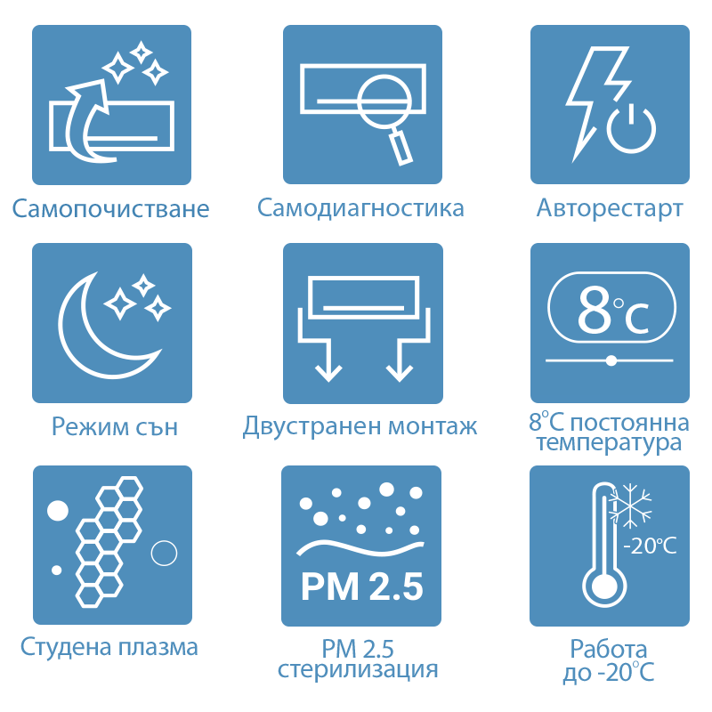 | Консумация | Охлаждане | 0.29 / 1.65 / 2.1 kW |